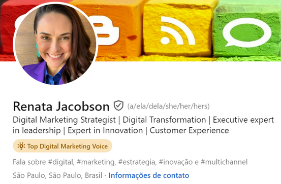 Em 2023 recebi o selo de TOP DIGITAL MARKETING VOICE pelo Linkedin.